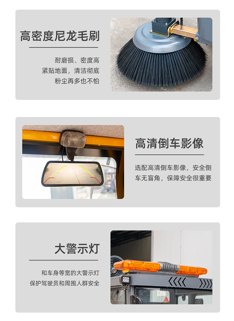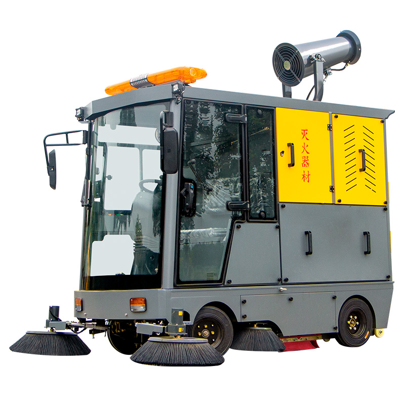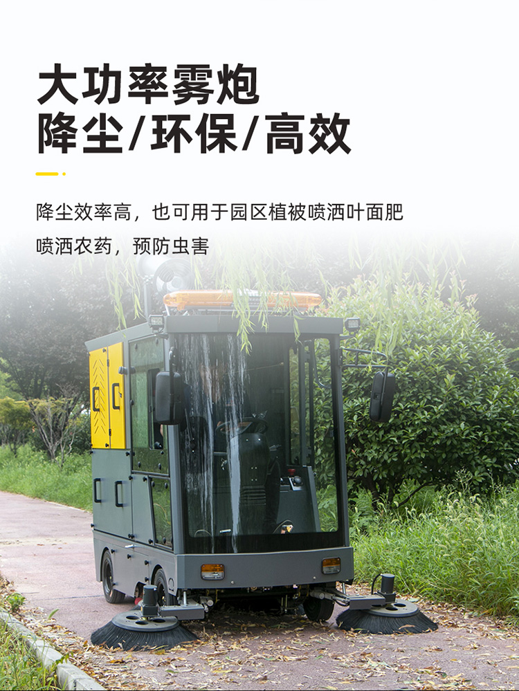 莱特LT-G23型,全封闭四轮驾驶式扫地车,配备高压清洗和高压雾炮功能,清扫宽度2300mm,满电工作时间为4-6小时,工作效率20000㎡/h,采用的是200A锂电池,高压雾炮射程可达10米以上,可对作业环境高效的降尘,还可以用于绿植养护和环境消杀。高压水枪可以对地面顽固污渍进行清洁,还可以冲洗路牙石,为绿植浇水,工作之余,还可以用高压水枪清洗车辆。应用场景为:厂区、车间、公园、街道、物业小区、码头、学校、机场等需要大面积清扫的区域区域。
